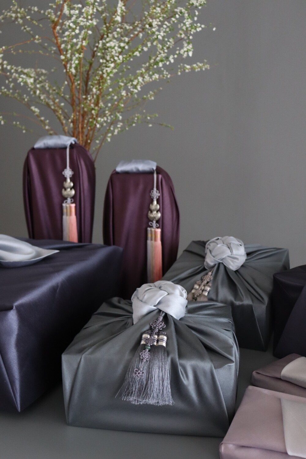 현금예단비, 화장품, 지갑, 벨트, 넥타이, 셔츠, 스카프, 과일, 떡, 양주 등의 음식도 포장이 가능합니다.